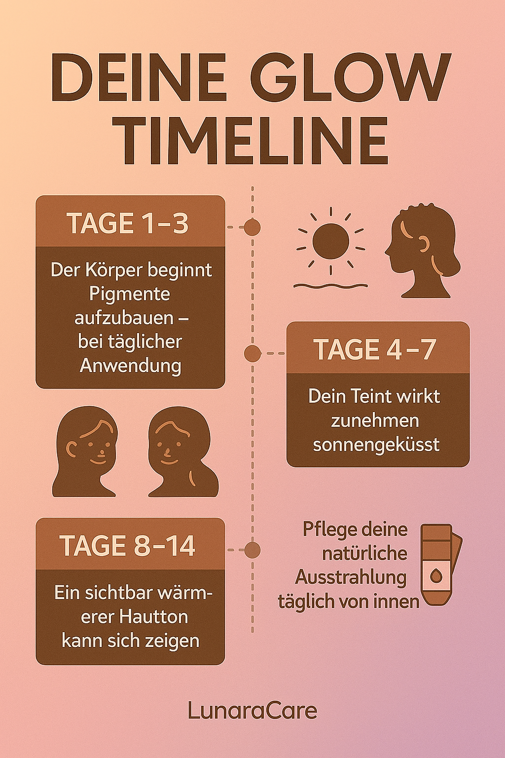 Die meisten Anwender:innen bemerken innerhalb von 5 bis 7 Tagen regelmäßiger Anwendung eine allmähliche Bräunung.